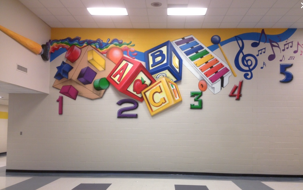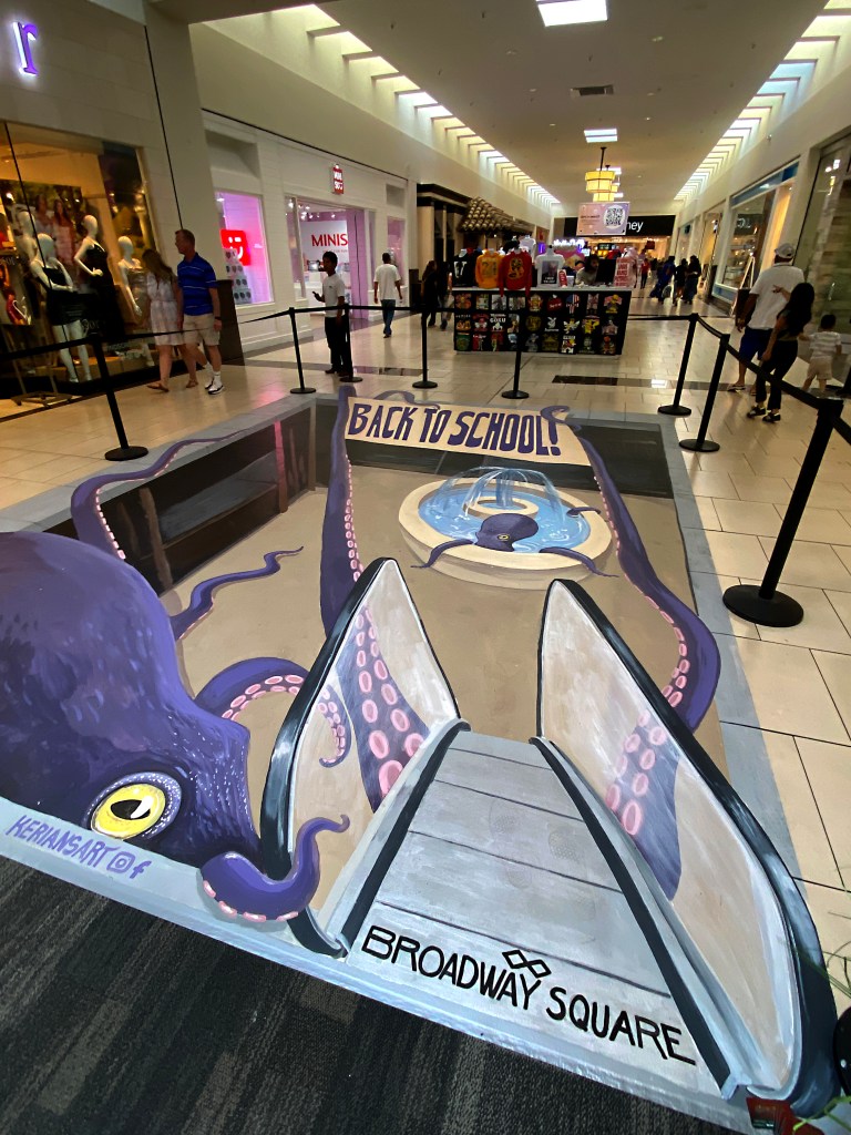 This is an anamorphic mural that was installed over a 5 day period in the Broadway square mall in Tyler, TX. Back to school with a fun nod to the old fountain the mall had along with a “stranger Things/Funny stuff going on in the basement of the mall vibe.”