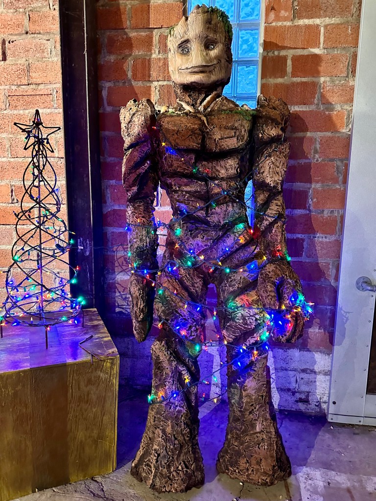 So every year Lindale Tourism decorates their Blackberry Pavilion and I get the honor to create some fun budget friendly characters, sets and backdrops. The Christmas prior to the 2024 eclipse was used as a lead-up to the actual event, so we decided to go with a few galaxy themed vignettes including Guardians of the Galaxy because of their fun Christmas special. I built this 8′ tall Groot from MDF, spray foam and modeling foam. He was such a hit!